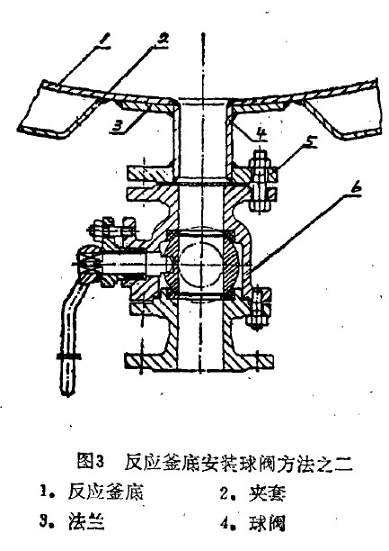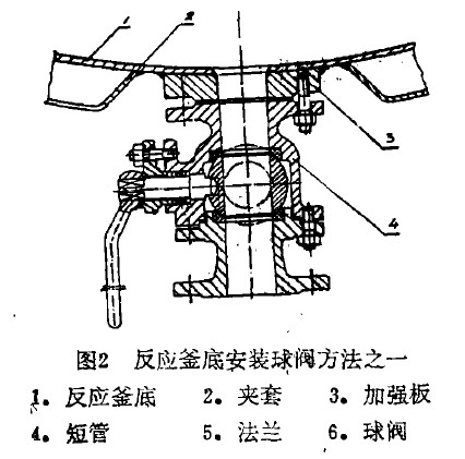 此形式是標(biāo)準(zhǔn)放料閥的性能不能滿足要求時(shí)的常用方式,可任意選用材-料相性能規(guī)格能滿足要求的通用型截止閥、閘閥或球閥等作為放料閥。近廿余年來由于球閻的迅猛發(fā)展,球閥具有流阻小、體積小,重量輕、操作靈便、不易積料等優(yōu)良性能,當(dāng)前大多都選用通用球閥安裝于放料的短管下作放料閥,如圖2所示。由于球閥有低壓和中壓多種壓力等級可選用,故此種形式在低鹺和中壓反應(yīng)釜上都可適用。