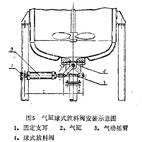 圖5為氣動球式放料閥在反應(yīng)釜上的安裝實(shí)例示意圖,圖中表明了氣缸2呈水平狀安裝于球式放料閥的一側(cè),活塞桿與殊式放料閥的氣動搖臂3的一端采用絞接方式。氣缸2的固定端則以支耳絞接形式懸掛在固定支耳1上,固定支耳1則可固定安裝在反應(yīng)釜的支腿上或其他穩(wěn)定性好的任何混凝土構(gòu)件上。