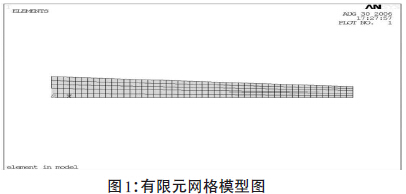 1.劃分網(wǎng)格,根據(jù)假定條件建立模型,用大型軟件ANSYS處理程序PREP7,選擇單元類型,確定層間流體參數(shù),建立楔形間隙流動場的有限元模型,并進行網(wǎng)格劃分。采用2D.fluid141單元類型自下向上建立模型,節(jié)點共有368點和270個單元。因層間液膜厚度很薄,為了清楚描述建模,將楔形膜厚擴大12倍。得到圖1所示有限元網(wǎng)格模型圖: