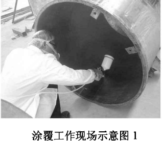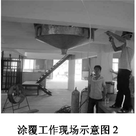將150L的不銹鋼反應(yīng)釜側(cè)放在水平地面,操作人員鉆進反應(yīng)釜,對反應(yīng)釜內(nèi)壁進行噴涂。為避免霧氣對人員在操作過程中的傷害,噴涂人員佩戴防毒面具,頭戴防塵帽。并在反應(yīng)釜開口處安裝了工業(yè)風(fēng)扇對霧氣進行消除,以減少對人體的傷害。