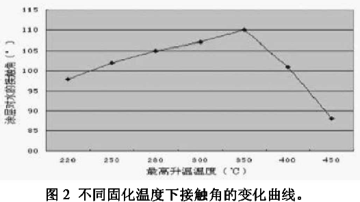 我們發(fā)現(xiàn)固化溫度影響涂層的表面性能。為優(yōu)化固化溫度,涂層在20一450℃不同溫度下固化,測試涂層的接觸角,見圖2。結(jié)果表明,涂層固化溫度在350℃時,對水的接觸角達到較大值,為110“。圖2不同固化溫度下接觸角的變化曲線。